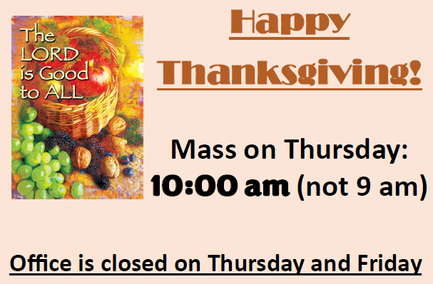 Adoration of the Blessed Sacrament – On the first Thursday of every month, in the chapel, 6:00-7:00 pm. This is a beautiful opportunity to spend time with Jesus, rest and be nourished from his presence
