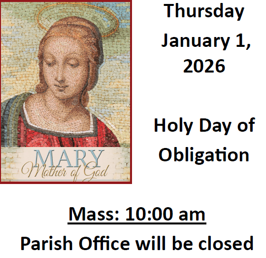Thursday, January 1, 2026: Solemnity of Mary Mother of God – Holy Day of Obligation – Mass at 10:00 am