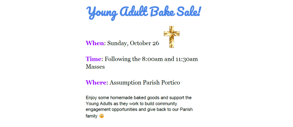 Our Young Adult Group is hosting a Bake Sale on Sunday, October 26, outside in the Portico! Enjoy delicious homemade treats and help support our young adults as they strive to give back to our Parish Family and engage in more community outreach opportunities. You are welcome to donate baked goods, but no pressure — the young adults have everything covered. Thank you in advance for your support!